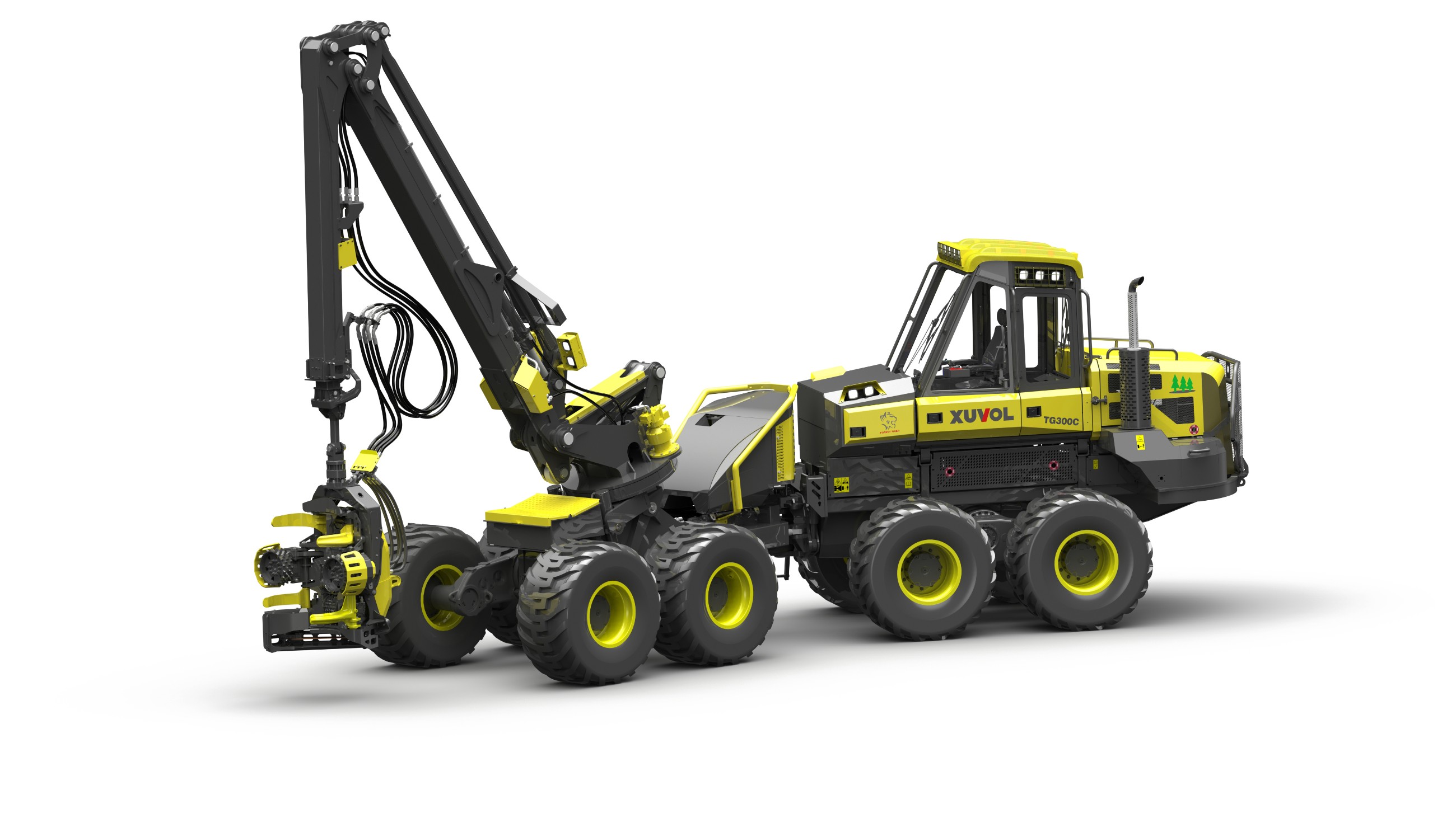 中国首台(套) 徐沃林间轮式采伐机TG300C是中国自主设计第一台、自主生产第一台、自主销售第一台、出口海外第一台的大型林业机械。新型XUVOL采伐机采用独特的八轮浮动铰接式车架,越野性能优异,加上动力强劲的六缸发动机、大流量液压泵、充裕的散热性能,无论是在寒冷的森林还是炎热的雨林都能从容应对,无惧陡坡、泥泞道路、厚亏,砥砺前行。经过不断调教改进,它的起重臂和伐木机头操作精准,且容易上手使用,基于强劲可靠的硬件和人性化的操控体验,使得XUVOL采伐机成为一款优秀的林业采伐工具,一个称心如意的好帮手。